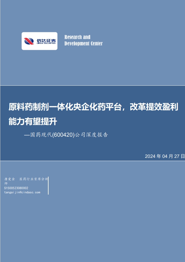 国药现代为国药集团旗下的化药工业平台,经过多年的发展和整合已经形成中间体原料药制剂一体化实力化药平台性工业企业,我们认为公司当期盈利水平有提升空间,借力央企提质增效改革利润端有望加速增长。