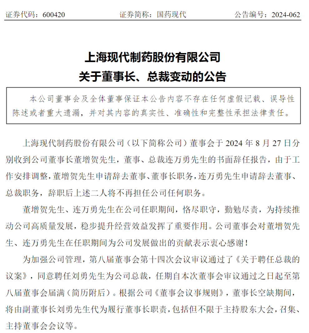 8月27日盘后,国药现代宣布,公司董事长董增贺和董事、总裁连万勇辞职。辞职后,二人不再担任公司任何职务。