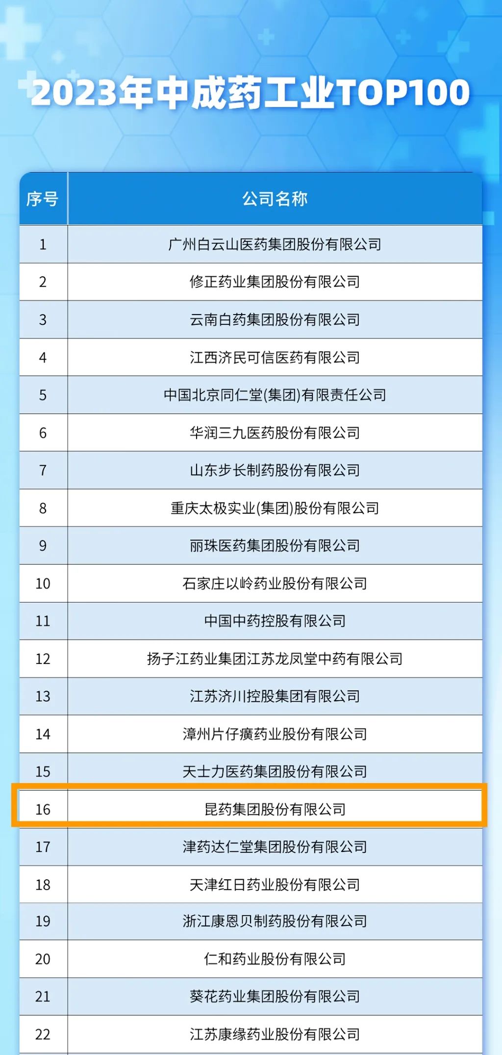 此次大会公布2023年度中药行业品牌名单,共有6项品牌报告发布。其中,首次推出“中药创新品牌企业(2023)”,旨在加强中医药科研和创新,推动传统中医药和现代科学相融合,进一步推动中医药产业的高质量发展,本次榜单共29家企业,昆药集团荣耀上榜,位列12。同时,会议还发布了“2023中成药工业TOP100”榜单,昆药集团位列16。