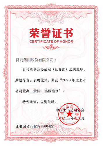 12月12日,由中国上市公司协会主办的“2023上市公司董办最佳实践”创建活动结果正式发布,昆药集团荣获“2023年度上市公司董办最佳实践案例”。本次评选共有200家上市公司荣获“上市公司董办最佳实践案例”,291家上市公司荣获“上市公司董办优秀实践案例”。昆药集团已连续两年分别入选“优秀实践案例”和“最佳实践案例”,体现了中国上市公司协会对公司合规治理经营、高效运作管理和充分回应市场关切等工作的高度肯定。