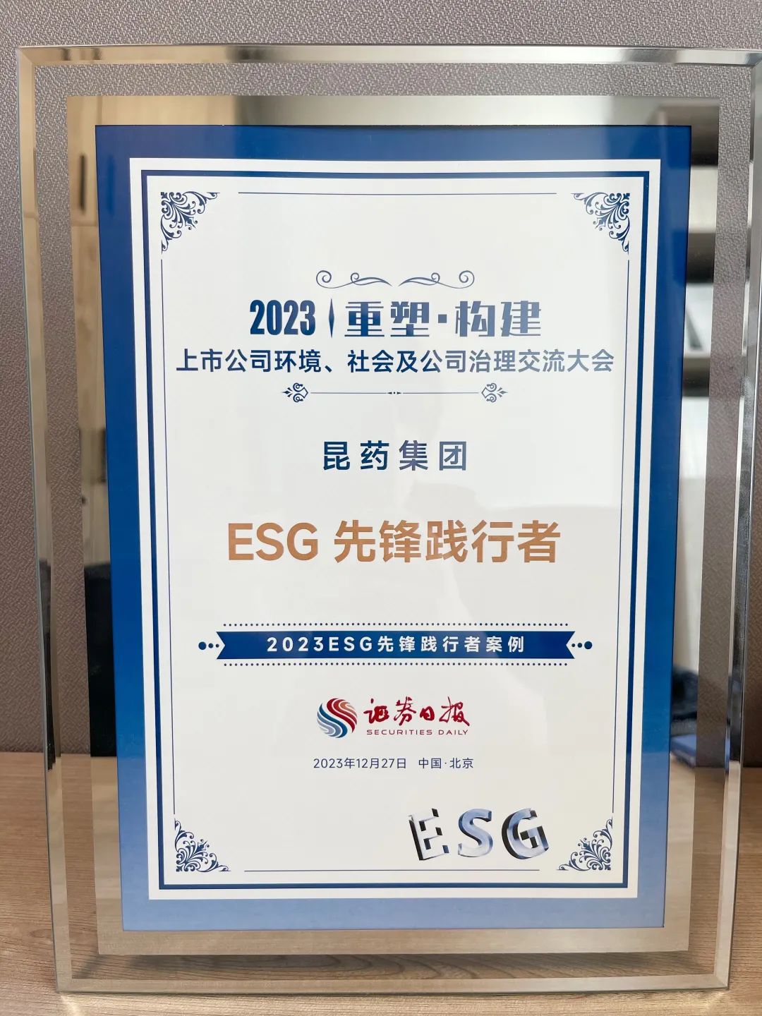 近日,由证券日报主办、国新咨询协办的“2023上市公司环境、社会及公司治理交流大会”在北京成功举办。本次论坛以“重塑·构建”为主题,邀请相关部门代表、专家学者、企业代表、投资机构、媒体等各方人士,围绕企业价值重塑、发展前景展望、构建中国特色ESG生态体系等话题深入交流,并发布了《2023中国ESG发展报告》,为ESG发展提供借鉴和启示。昆药集团凭借在绿色可持续发展、社会责任及公司治理等维度的卓越表现,成功荣获“2023上市公司ESG先锋践行者”荣誉。