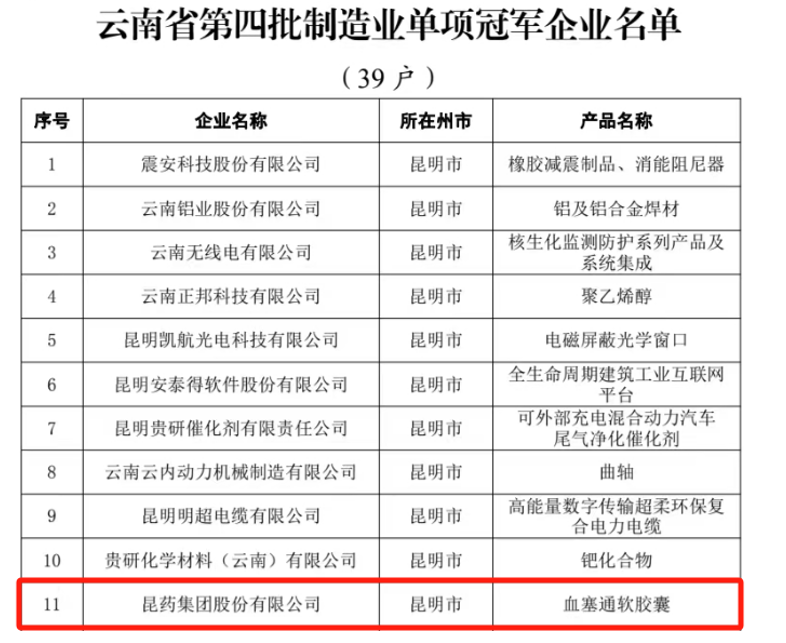 近日,云南省工业和信息化厅公布“云南省第四批及通过复核第一、二、三批制造业单项冠军企业名单”,确定了39户云南省第四批制造业单项冠军企业,昆药集团凭借血塞通软胶囊,成功入选“云南省第四批制造业单项冠军企业”。