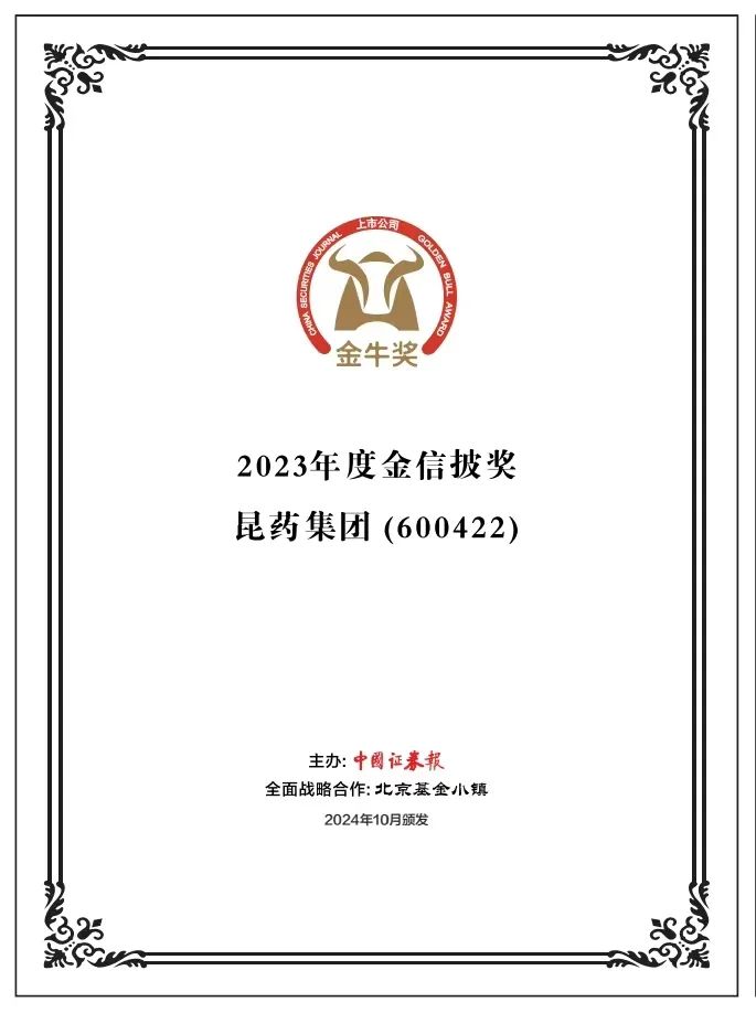 另一方面,由中国证券报与南通市人民政府主办、北京基金小镇全面战略合作的2024上市公司高质量发展论坛暨第二十六届上市公司金牛奖颁奖典礼在江苏南通举行。此届“金信披奖”正是以交易所信披评价为“A”、“B”的非金融类A股上市公司作为样本企业,在经过了入围标准样本剔除后,入围参选样本为A股4208家上市公司。该奖项入围条件严谨、客观、科学、透明,是中国资本市场最具公信力和影响力的权威奖项之一。在综合考虑公司领导能力、行业影响、社会责任以及治理体系等多个维度的情况下,昆药集团在2022-2023年连续两年荣获“金信披奖”。