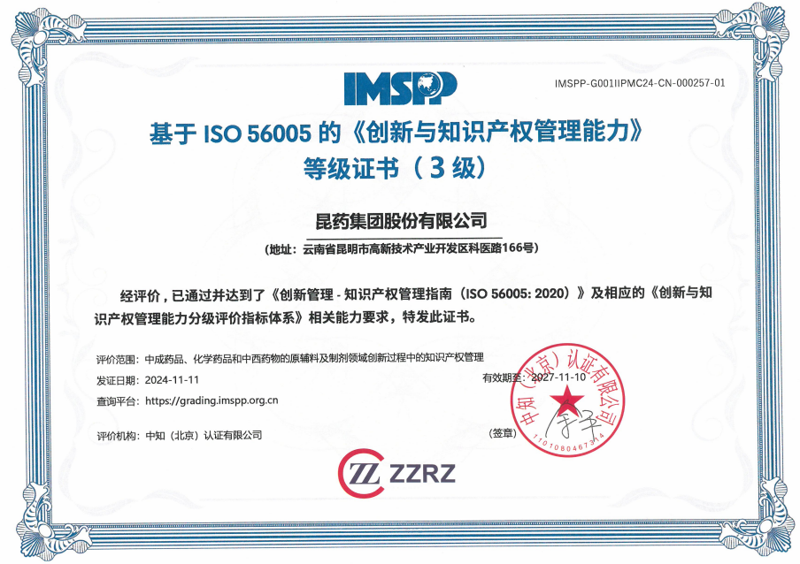 经过六个多月周密严谨的筹备与高效的组织推动工作,近日昆药集团顺利通过了中知(北京)认证有限公司的全面审核与高标准评估,成功荣获ISO 56005“创新与知识产权管理能力(3级)体系认证证书”,成为云南省首批通过此分级评价的企业,亦是当前云南省唯一达到三级标准的企业。此举标志着昆药集团在创新与知识产权管理领域实现了新的跨越。