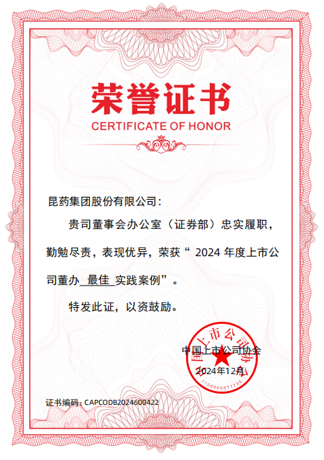 12月19日,中国上市公司协会"2024上市公司董办最佳实践"评选结果揭晓。昆药集团凭借在公司治理、董事会业务、信息披露、投资者关系管理、市值管理、ESG管理等方面的优异表现,再次荣获"2024上市公司董办最佳实践案例"。