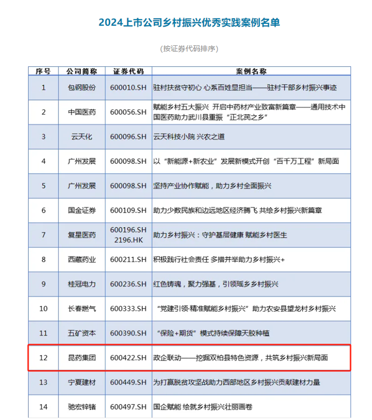 近日,中国上市公司协会揭晓了“中国上市公司协会2024上市公司乡村振兴最佳实践案例”评选结果。昆药集团以《政企联动——挖掘双柏县特色资源,共筑乡村振兴新局面》案例,凭借在乡村振兴领域的全面布局与显著成效,再度入选《优秀实践案例》,这已是昆药集团连续三年获得此项荣誉。