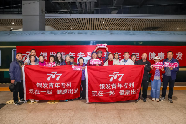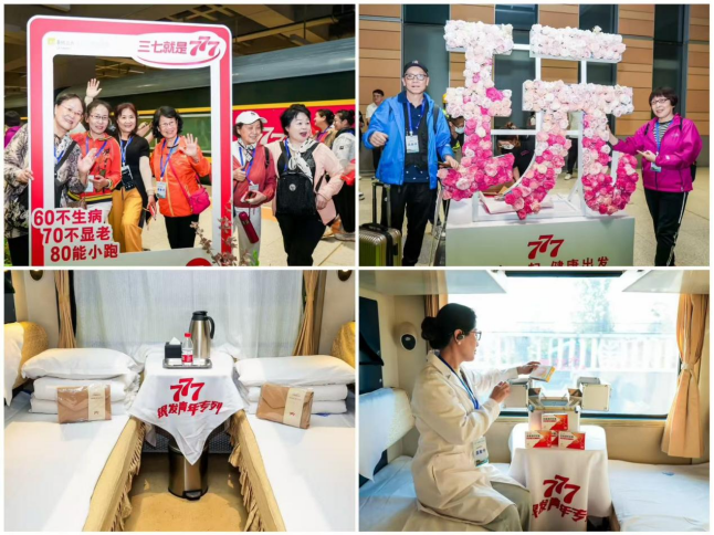 2025年5月23日,“777银发青年专列”从北京丰台站温情首发。项目联合中铁旅集团,打造为期三天的康养主题旅程,跨越吴桥杂技大世界、东光铁佛寺、沧州园博园等文化地标。列车全面进行适老化改造——软卧铺位加宽加高、全程医护随行、配备心脑血管应急药品,并设置“银发大舞台”互动专区,构建了安全、舒适、欢乐的移动健康社群。旅途中,银发旅客们在景点打卡、车厢互动中绽放活力,生动诠释“60不生病,70不显老,80能小跑”的健康生活理念。