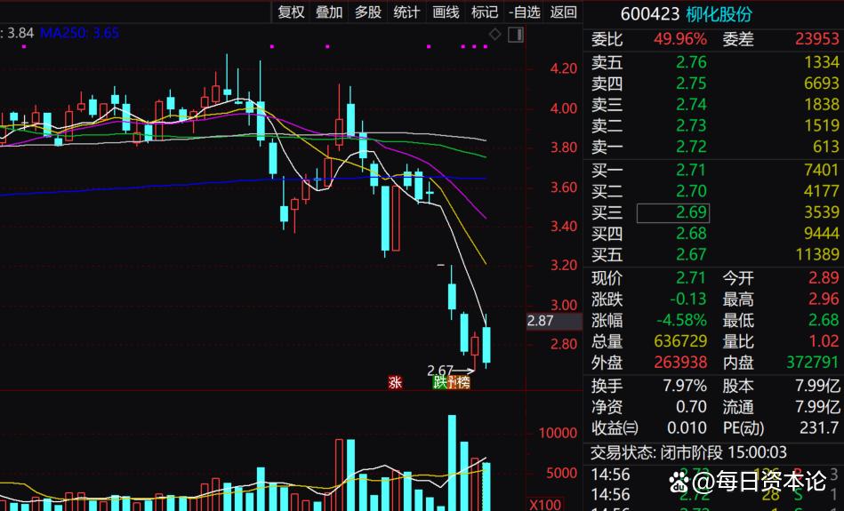 敏感的资本市场迅速做出反应。4月13日一开盘,柳化股份就被死死地摁在了跌停板上。此后,柳化股份遭遇了连续大跌,最低探至2.67元,接近历史最低价区域。截至4月17日收盘,其股价为2.71元/股,下跌4.58%,日k线呈现单边下跌趋势,尚未有止跌企稳迹象。