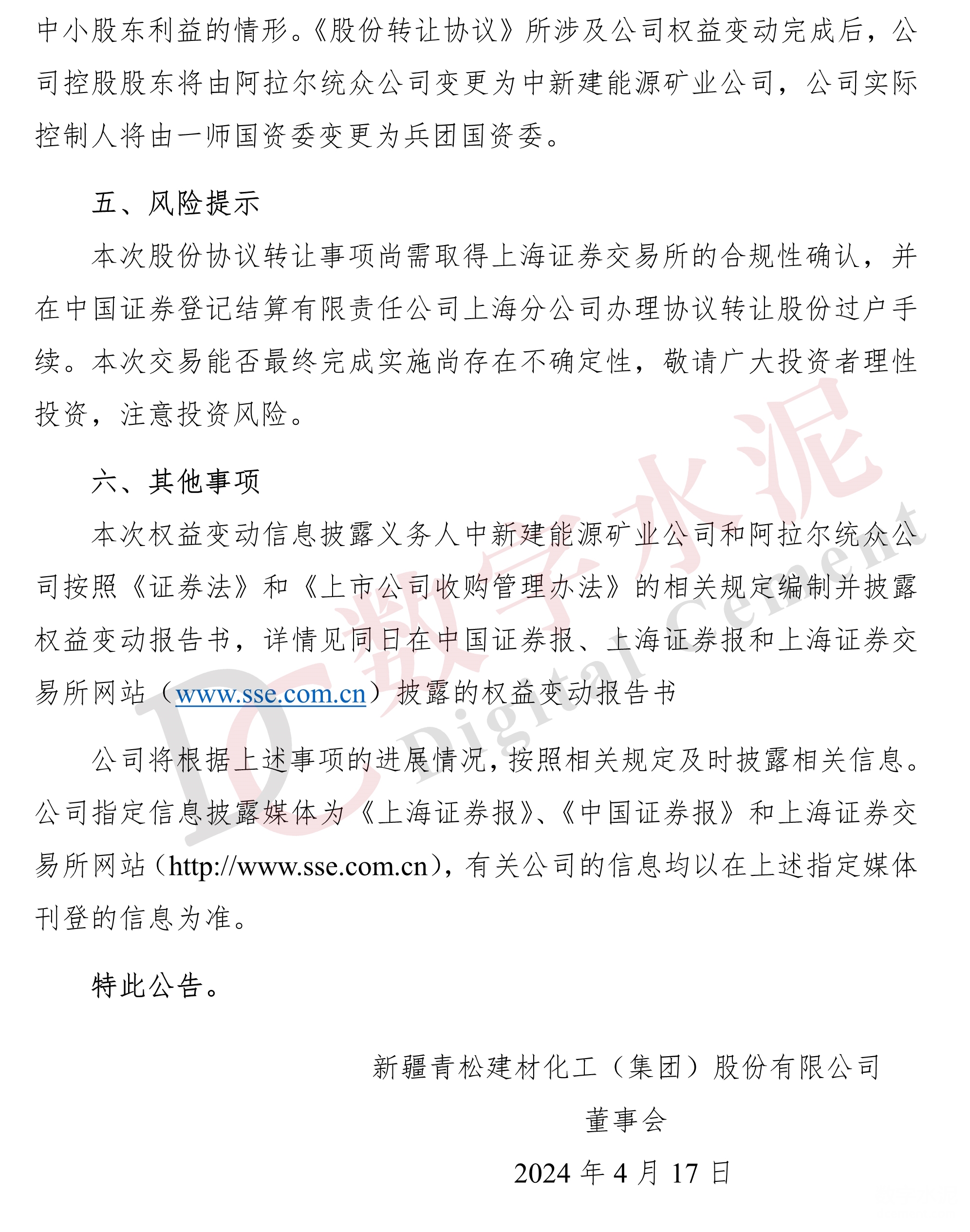 4月17日,青松建化发布《关于控股股东签署《股份转让协议》涉及控股股东及实际控制人拟变更的提示性公告》称,2024年4月16日,新疆青松建材化工(集团)股份有限公司控股股东阿拉尔统众公司与中新建能源矿业公司签署了《阿拉尔市统众国有资本投资运营(集团)有限责任公司与新疆中新建能源矿业有限责任公司之股份转让协议》。