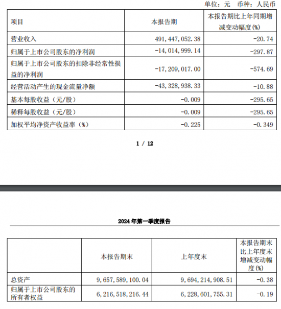 青松建化发布2024年第一季度报告。2024年第一季度,公司实现营业总收入4.91亿元,同比下降20.74%;归母净利润-1401.5万元,同比下降297.87%;扣非净利润-1720.9万元,同比下降574.69%;经营活动产生的现金流量净额为-4332.89万元,同比下降10.88%;基本每股收益为-0.009元,加权平均净资产收益率为-0.225%。