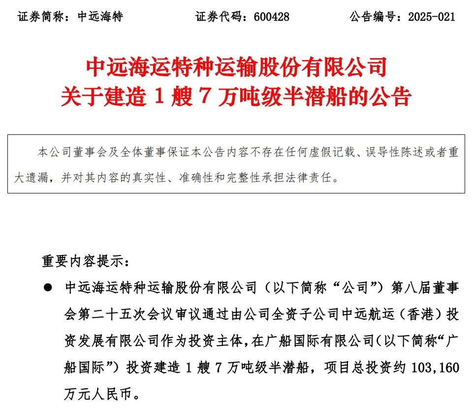 在发布财报的同日,中远海特宣布,为了加快推进公司发展战略转型升级,进一步扩大公司在半潜船“运输+安装”领域的领先优势,持续做大做强公司半潜船队,经公司第八届董事会第二十五次会议审议通过,拟由公司全资子公司中远航运(香港)投资发展有限公司作为投资主体,在广船国际投资建造 1 艘 7 万吨级半潜船,项目总投资约 103,160 万元人民币。