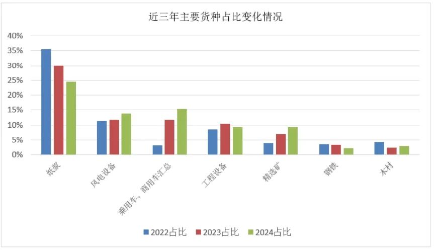 产业链经营业务:报告期,公司持续稳步推进纸浆物流产业链、工程项目物流产业链和汽车物流产业链拓展,进一步延伸传统航运服务触角,大力整合多式联运和物流节点资源,为客户提供“端到端”物流供应链服务,实现从单一“海上运输”向“产业链经营”转型,2024 年纸浆物流分拨货量同比增长 2.81%,贡献收入同比增加 11.10%;公司项目物流通过创新解决方案,打造差异化服务,深化战略合作,持续提升客户服务水平,完成埃及、老挝等风电全程物流项目,持续为三一等提供工程车辆地面服务,年内签订多个行业头部客户项目,执行期覆盖至未来两年;公司汽车物流产业链,成功打造“汽车船滚装+重吊船吊装+专用框架搭配多用途纸浆船”的组合运输模式,框架箱运车同时为客户提供拆装箱等延伸服务;完成太仓铁路场站建设,打通阿联酋到约旦的内陆转运通道,落地极氪首个欧洲 C 段仓储、PDI 和分拨一体项目。