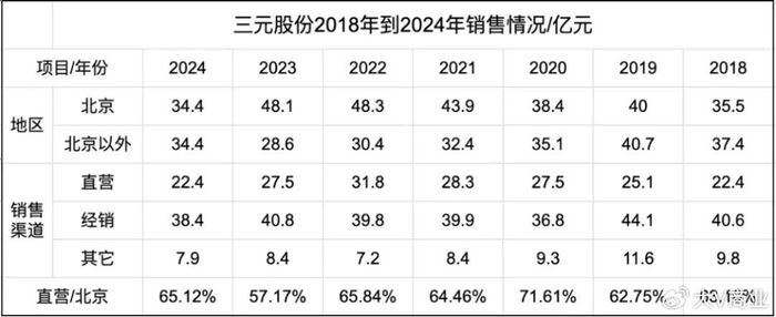 (三元2018年到2024年分地区和渠道的销售情况,数据来自于各年财报)