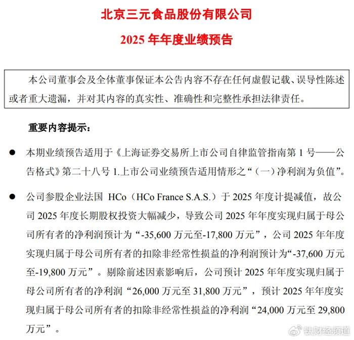 明面上,三元股份将亏损的主要原因归结为海外参股企业法国HCo计提商誉减值。公告显示,如果剔除这一影响,公司预计归母净利润为2.6亿元至3.18亿元,扣非后为2.4亿元至2.98亿元,同比还能实现大幅增长。