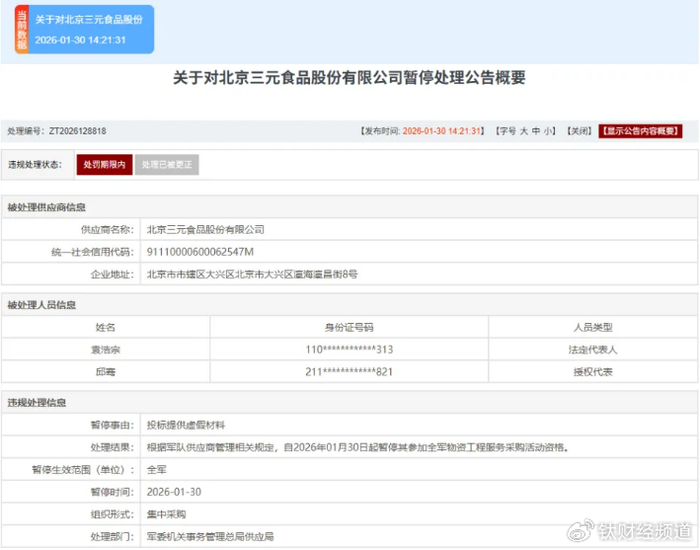 日前,据军队采购网报道,北京三元食品股份有限公司(以下简称“三元股份”)因在投标过程中提交虚假材料,被暂停参加全军物资、工程、服务采购的资格。依据相关规定,自2026年1月30日起,三元股份被禁止参与全军所有单位的集中采购活动。
