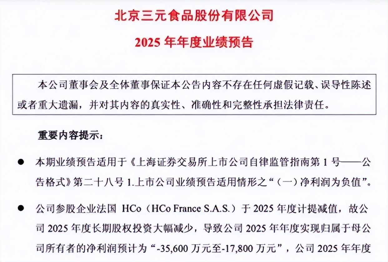 受市场需求下滑、外部竞争加剧等不利因素影响,法国HCo预计于2025年度计提商誉减值,导致三元股份长期股权投资账面价值预计减少4.96亿元至6.16亿元,直接拖累了公司整体业绩。