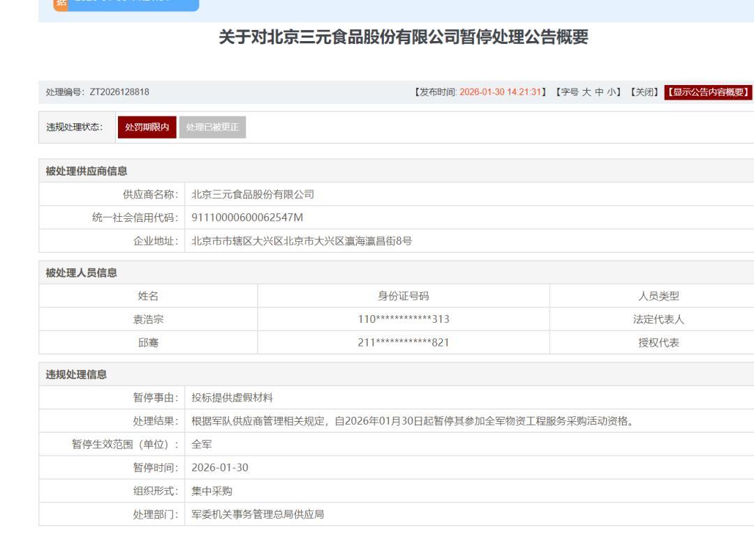军队采购网发布的《关于对北京三元食品股份有限公司暂停处理公告概要》明确显示,三元股份在参与编号为2024-VQ01-W1059的军队采购项目中,存在“投标提供虚假材料”的严重违规行为。