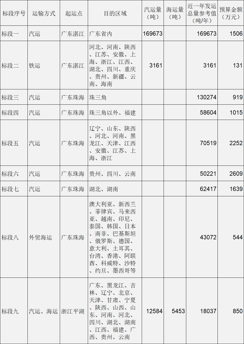 1、本表中描述的运量为近一年发运总量的估算,具体结算量以实际发生的数量为准。