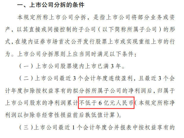 根据《分拆规定》,上市公司分拆原则上应满足的一个条件便是“上市公司最近3个会计年度连续盈利,且最近3个会计年度扣除按权益享有的拟分拆所属子公司的净利润后,归属于上市公司股东的净利润累计不低于6亿元人民币”,其中净利润以扣除非经常性损益前后孰低值计算。