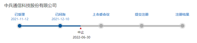 2022年06月30日,北京证券交易所审核项目动态显示,中兵通信审核状态变更为“中止”。