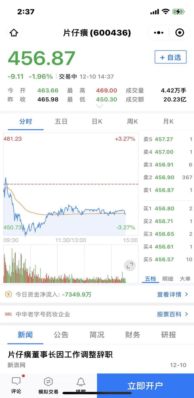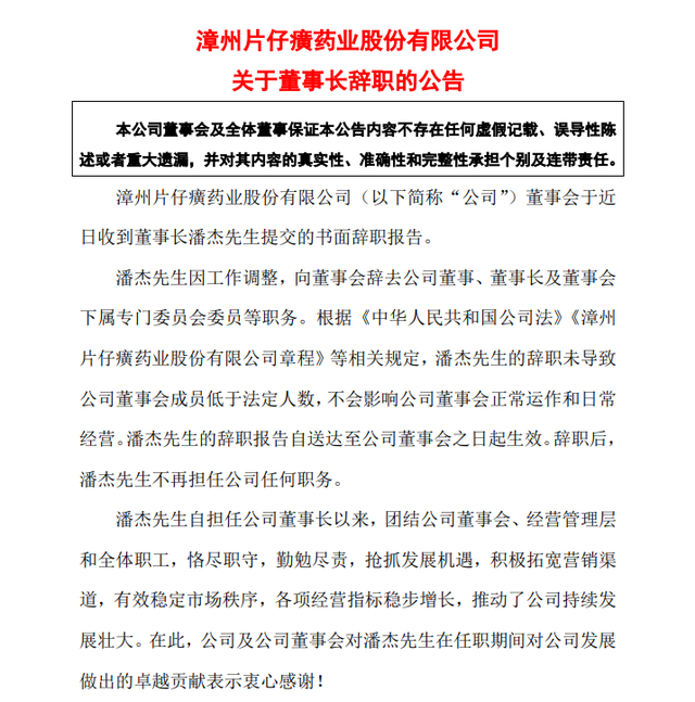 12月9日晚,片仔癀股份有限公司发布了《漳州片仔癀药业股份有限公司关于董事长辞职的公告》,公告称:漳州片仔癀药业股份有限公司(以下简称“公司”)董事会于近日收到董事长潘杰先生提交的书面辞职报告。潘杰先生因工作调整,向董事会辞去公司董事、董事长及董事会下属专门委员会委员等职务。根据《中华人民共和国公司法》《漳州片仔癀药业股份有限公司章程》等相关规定,潘杰先生的辞职未导致公司董事会成员低于法定人数,不会影响公司董事会正常运作和日常经营。潘杰先生的辞职报告自送达至公司董事会之日起生效。辞职后,潘杰先生不再担任公司任何职务。