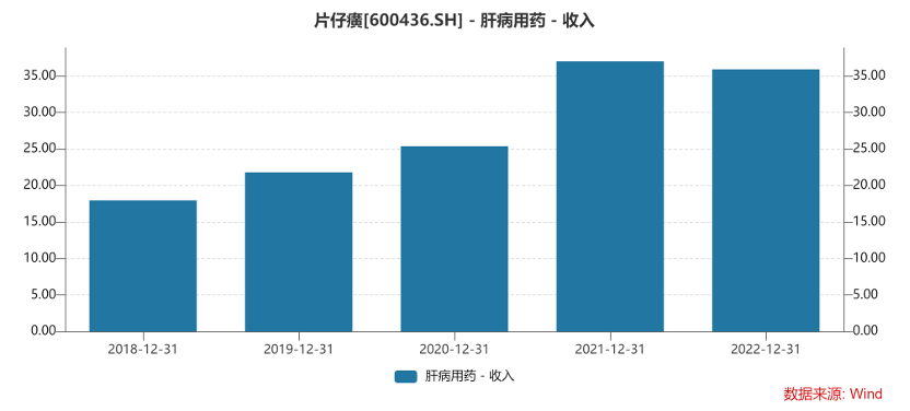2022年,片仔癀的肝病用药实现营业收入约36亿元,同比下滑2.95%,这是近五年来片仔癀首次出现肝病用药收入下滑。
