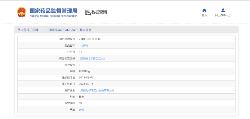 据国家药品监督管理局官网,片仔癀的保护期为10年,保护终止日为2024年9月15日。