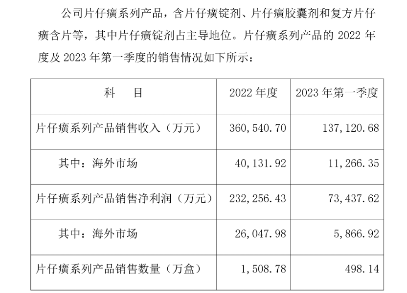 值得注意的是,片仔癀也在其公告中公布了片仔癀系列产品的2022年度及2023年第一季度的销售情况,该口径的片仔癀系列产品,含片仔癀锭剂、片仔癀胶囊剂和复方片仔癀含片等。