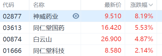 港股中医药股多数上涨,神威药业涨超8%、同仁堂国药涨5.66%、白云山涨3.12%。