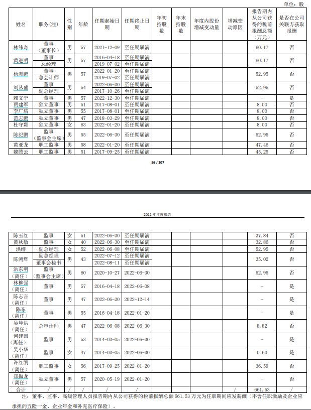 片仔癀2022年董事、监事和高级管理人员持股变动及报酬情况