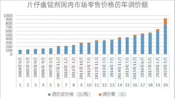 过去20年间,片仔癀多次提价。据西南证券不完全统计,2004年至2020年,片仔癀锭剂产品一共提价19次,零售价从325元/粒升至590元/粒,提价幅度81.54%。