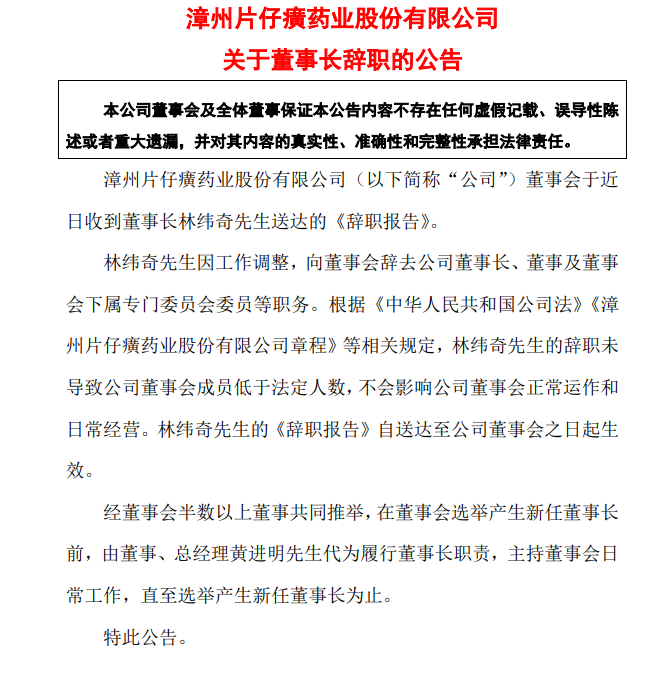 7月24日晚间,漳州片仔癀药业股份有限公司公告称,董事会于近日收到董事长林纬奇的辞职报告,林纬奇因工作调整,向董事会辞去公司董事长、董事及董事会下属专门委员会委员等职务。