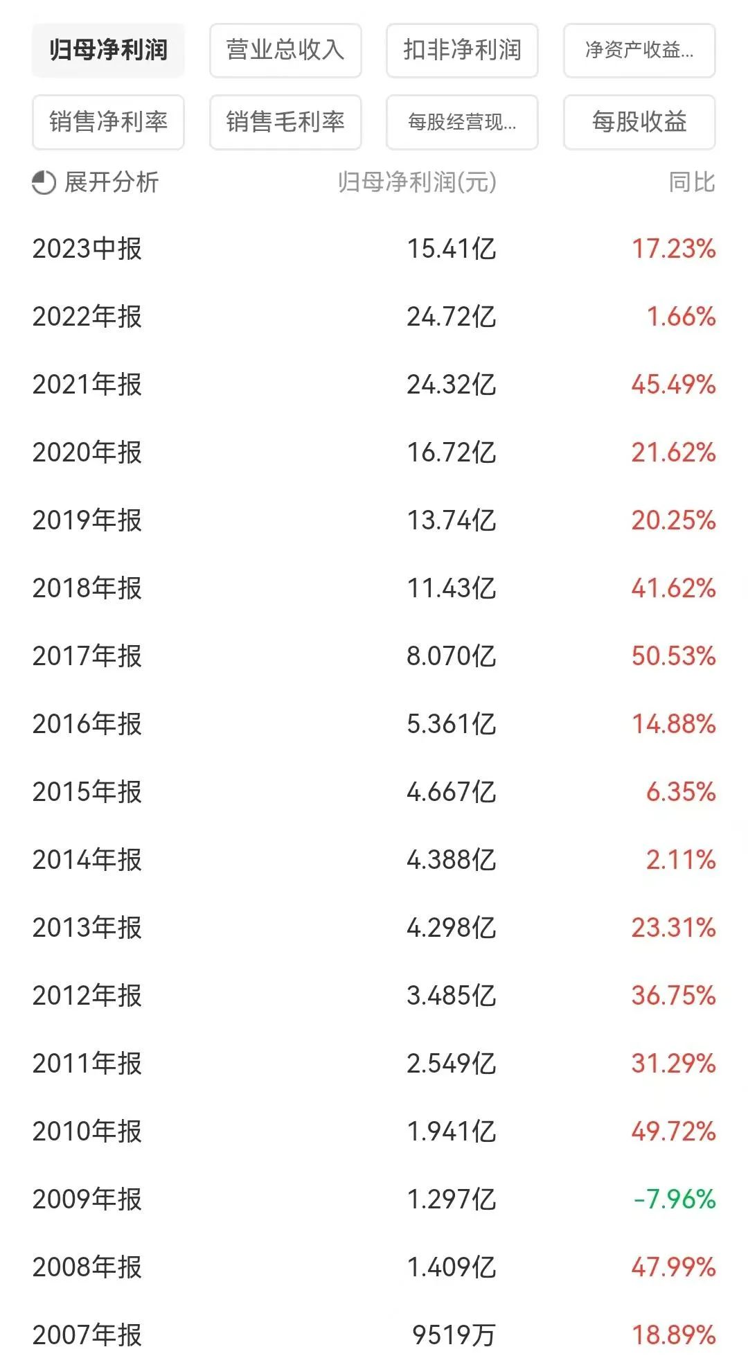 片仔癀公司的牛逼之处,自2003年上市以来,只出现过增速放缓,从来没有哪个年头亏损过,并且多数年头保持着两位数的高增长。即便是疫情中的2020年和2021年,依然保持着22%和45%的增长率。2021年、2022年的净利润连续创下了超过24亿元的历史新高。今年上半年,净利润已经达到15亿元,估计又是片仔癀公司发展史上的新高度。