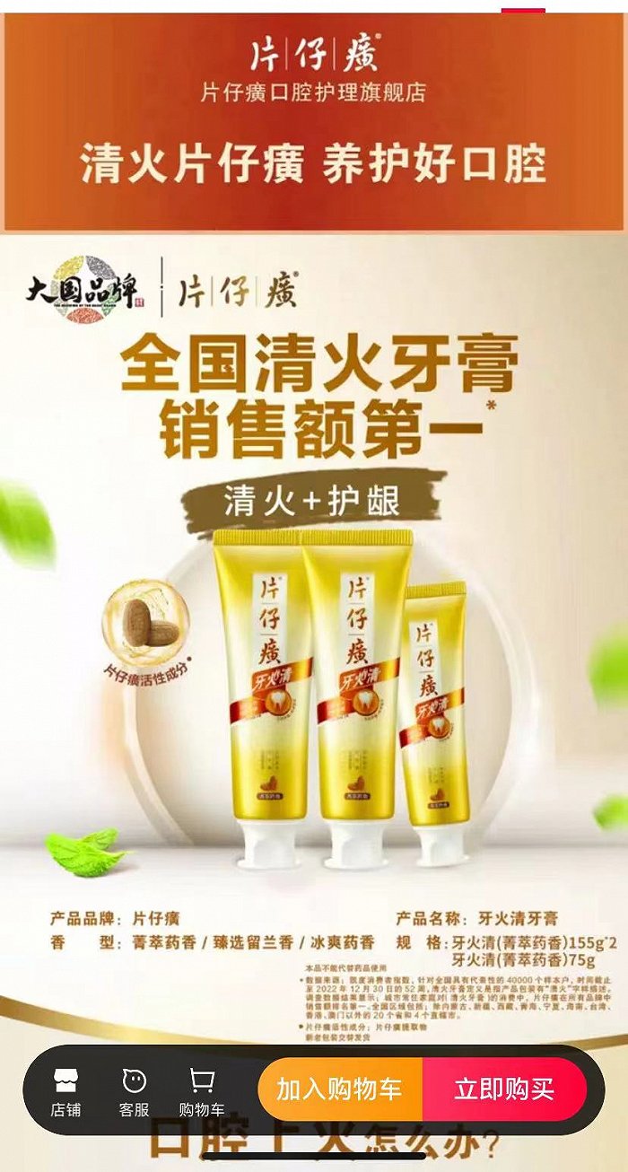 具体到涉事产品而言,“清火”是片仔癀牙膏的重要概念。在片仔癀口腔护理旗舰店的宣传海报中,这一系列牙膏还被宣传为“全国清火牙膏销售额第一”。