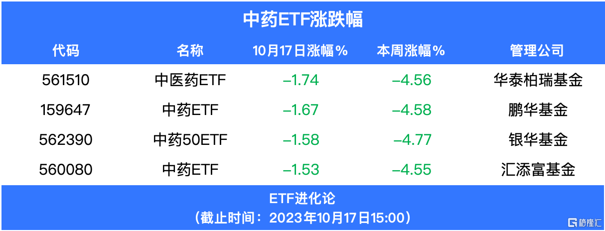 中药股下跌,片仔癀跌超5%,华泰柏瑞基金中医药ETF、鹏华基金中药ETF、银华基金中药50ETF 、汇添富基金中药ETF跌超1.5%,本周跌超4.5%。