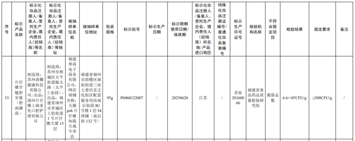 而这一次被抽检的片仔癀牙敏舒牙膏(舒润薄荷)菌落总数高达6.6×103CFU/g,是规定要求的13倍多。