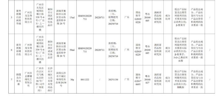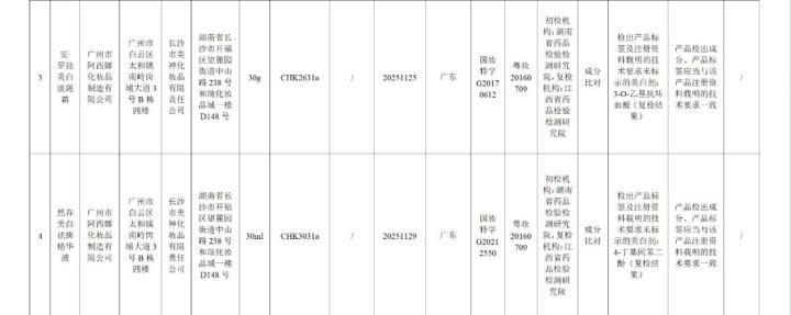 广州青岚生物科技也有两批次次的美白产品未按规定标示美白剂,其中,衡美肤耀白淡斑精华液,检出未标示的美白剂:β-熊果苷;衡美肤焕彩臻白乳,检出未标示的美白剂:β-熊果苷、3-O-乙基抗坏血酸。