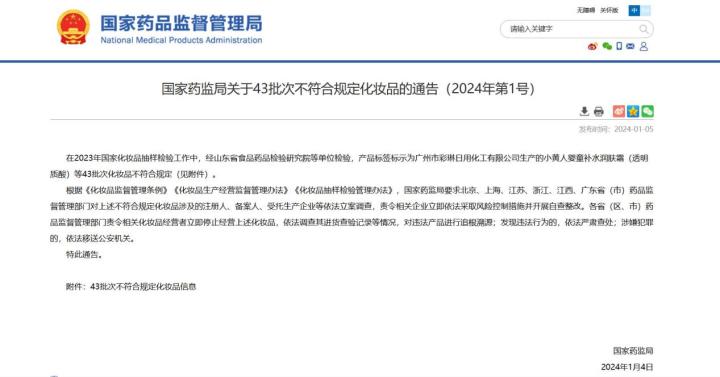 上周五,国家药监局对2024年首批不符合规定化妆品信息进行了通报,共有43个批次上榜。水杨酸超标、牙膏菌落总数超标、成分比对不符合规定等成为此次43个批次化妆品的主要问题。值得注意的是,新年刚开始,美白祛斑剂类产品成了重点监管对象,有6个批次产品未按规定标示美白剂。