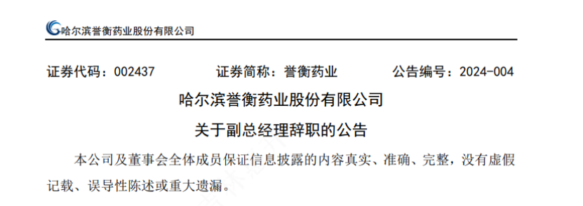 1月16日,誉衡药业股份有限公司发布公告,公司董事会收到臧家峰先生提交的书面辞呈,臧家峰先生因个人原因,申请辞去公司副总经理职务。辞职后,臧家峰先生不再担任公司任何职务;臧家峰先生的辞职申请自送达公司董事会之日起生效,截至目前,臧家峰先生未持有公司股票。