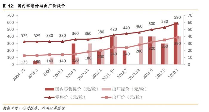 有这样的“法宝”,片仔癀非常热衷涨价。根据西南证券的统计,2004年至2020年,片仔癀锭剂一共提价19次,零售价从325元/粒升至590元/粒。从出厂价来看,片仔癀锭剂共提价10次,从2004年的125元/粒升至2020年1月初的390元/粒,提价幅度212%。