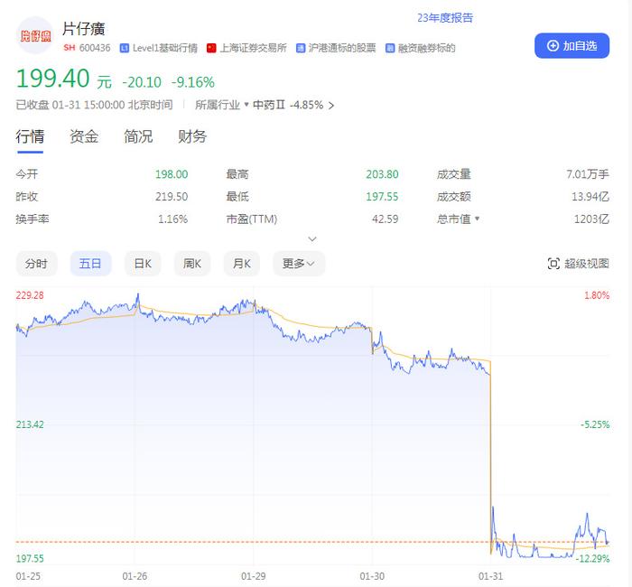 1月31日,片仔癀(600436)开盘股价大跌,截至收盘,片仔癀报199.4元,跌幅9.16%,总市值1203亿。这个股价,创下片仔癀三年多来的新低。