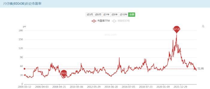 这样的“狂飙”之下,片仔癀的市盈率一度超过160倍。这啥概念呢?对比当时的“中国第一股”贵州茅台(56倍),足足翻了近3倍!
