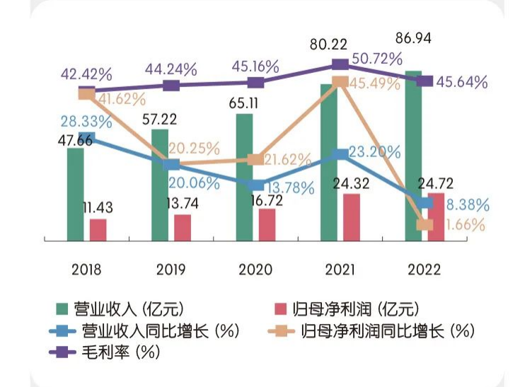 以2018年-2022年五年为时间维度,期间片仔癀营业收入保持正增长,年平均增速为18.75%,归母净利润增速要好于营业收入增速,五年平均增速为26.13%。