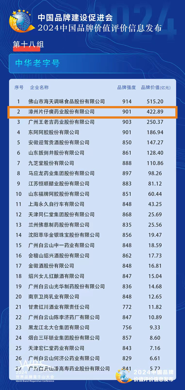 2024年5月11日,新华社、中国品牌建设促进会、中国资产评估协会等单位在浙江德清联合发布“2024中国品牌价值评价信息”,漳州片仔癀药业股份有限公司以品牌价值422.89亿元蝉联“中华老字号品牌”第2位,品牌价值较上一年提升13.52亿元。5月12日,在“2024《中国品牌十年路》发展报告发布会”中,片仔癀荣获“点赞2024我喜爱的中国品牌”。