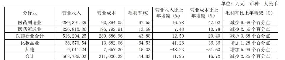 其中化妆品行业板块虽然营收占比较小,但取得了较好的成绩,其营收3.86亿元,同比增长41.26%,毛利率为64.53%,同比增加1.28个百分点。