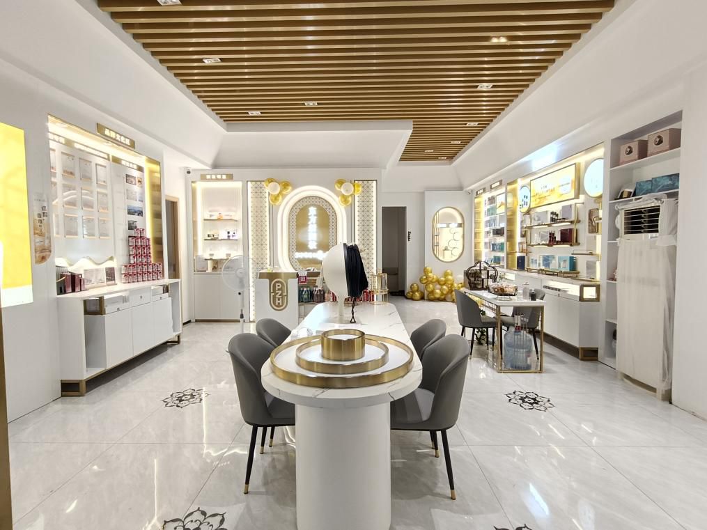 在店面形象升级上,片仔癀化妆品第二代体验店广泛采用新中式设计风格,以白金色调为主,辅以传统米字格窗花元素,营造出优雅、时尚、极富东方韵味的空间氛围。店内功能分区更加丰富,设有中式成分展示区、产品陈列区、轻体验区、品牌文化墙、文化走廊、护理区、社交沙龙区等,充分展现品牌的文化内涵和产品特色,为顾客打造沉浸式的体验空间。