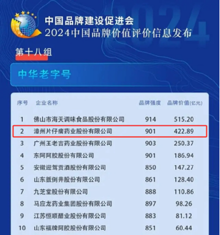 由国家发展改革委联合国务院国资委、市场监管总局、国家知识产权局共同主办的2024年中国品牌日活动揭晓“2024外国人喜爱的中国品牌”“点赞2024我喜爱的中国品牌”榜单,片仔癀成功入选。活动期间,片仔癀公司携手无人机表演亮相浙江德清,展现了片仔癀的历史文化积淀和中国医药制造业领军品牌的实力。