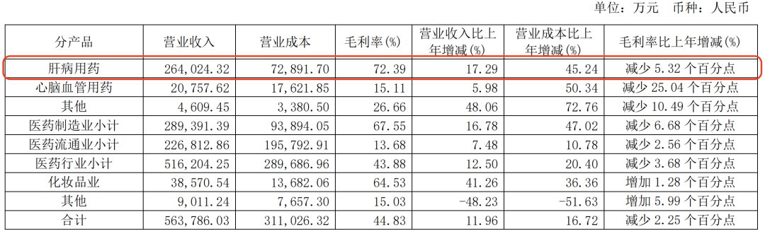 片仔癀2024年半年报显示,医药制造板块下的肝病用药,是片仔癀最核心的营收和利润来源,2024年上半年营收和毛利率分别为26.4亿元、72.39%,占全部营收和毛利额的比例分别为46.7%、75.6%。