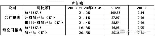 母公司营收,2003年2.05亿,2023年46.05亿,年化增长16.8%;净利润2003年0.61亿,2023年25.28亿,年化增长20.5%,成长性相当强。