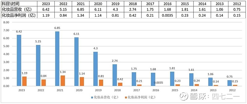 从公司2012年起单独披露化妆品行业的营收和净利润看,化妆品行业虽然成长性不错,但体量太小,而且发展过程中有一定的波动性。2021年营收和净利润创新高后,还在回调。
